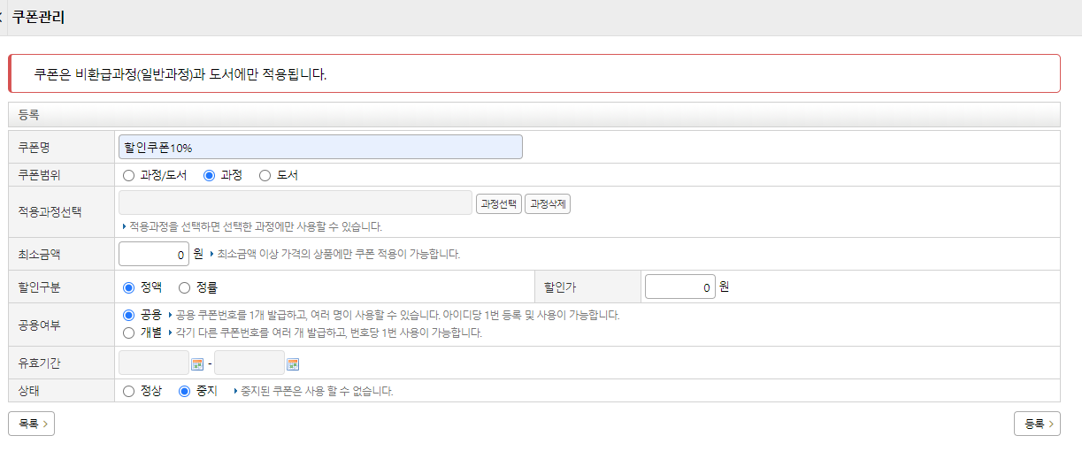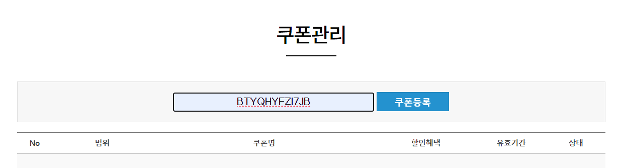 쿠폰관리 클릭 - 등록 버튼 - 쿠폰명 ~~상태 까지 기입후 등록