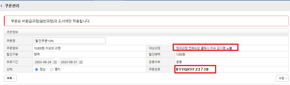 *쿠폰을 어떤특정 과정운영의 훈련생들에게만 쿠폰 제공 할 경우 이용 방법