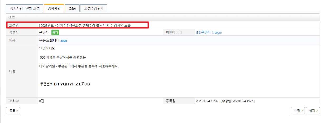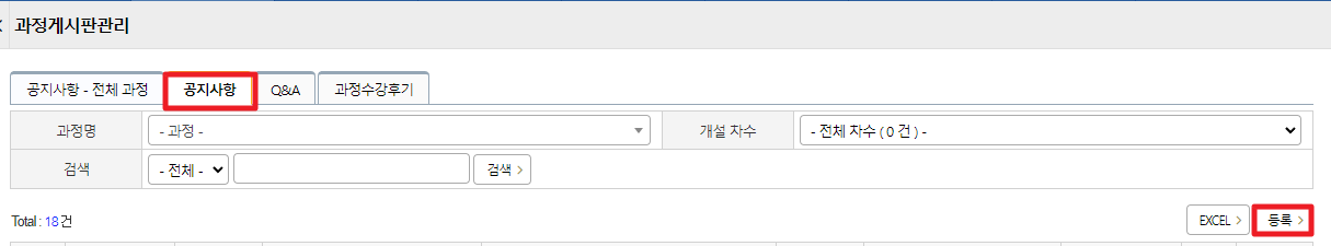 공지사항 클릭후 등록버튼 - 해당 과정명 과 차수를 클릭후 내용 기입