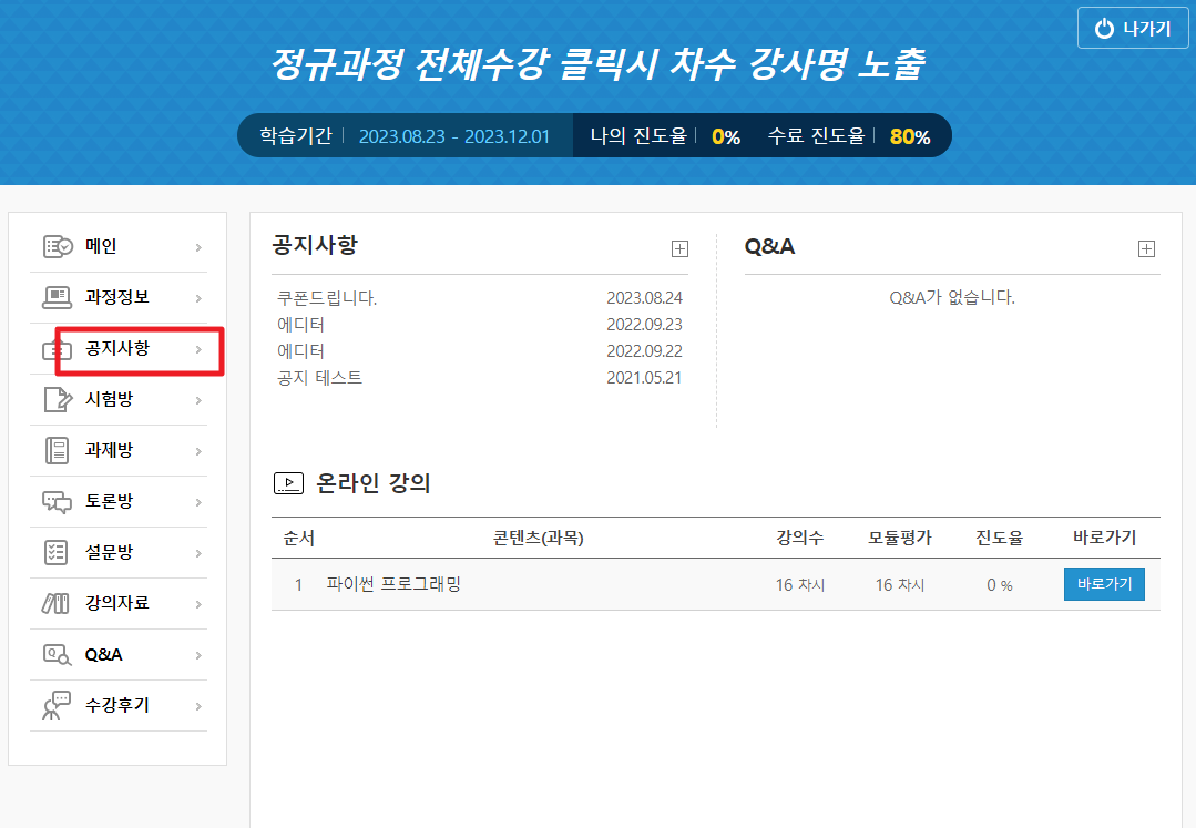 각 과정의 수강생들이 강의실 입장하시면 공지사항을 체크