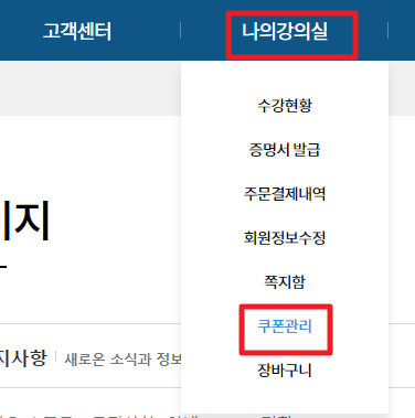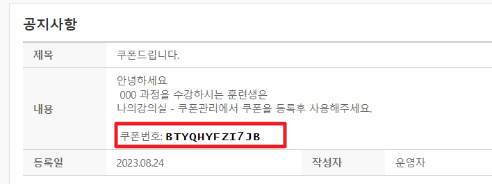 훈련생들이 쿠폰번호를 복사해서 나의강의실 > 쿠폰관리를 클릭후 해당 쿠폰번호를 붙여넣기 하시면 됩니다.