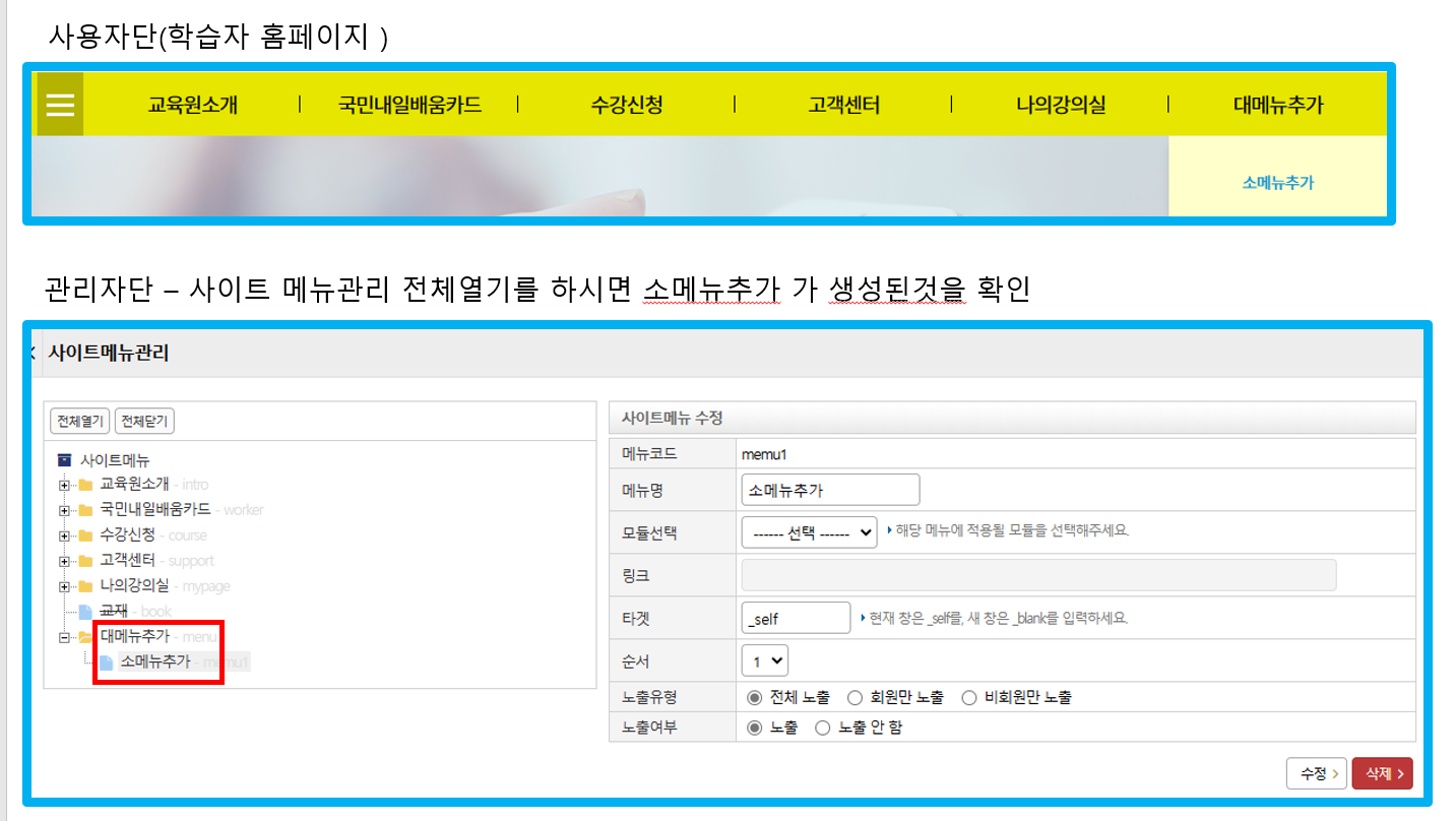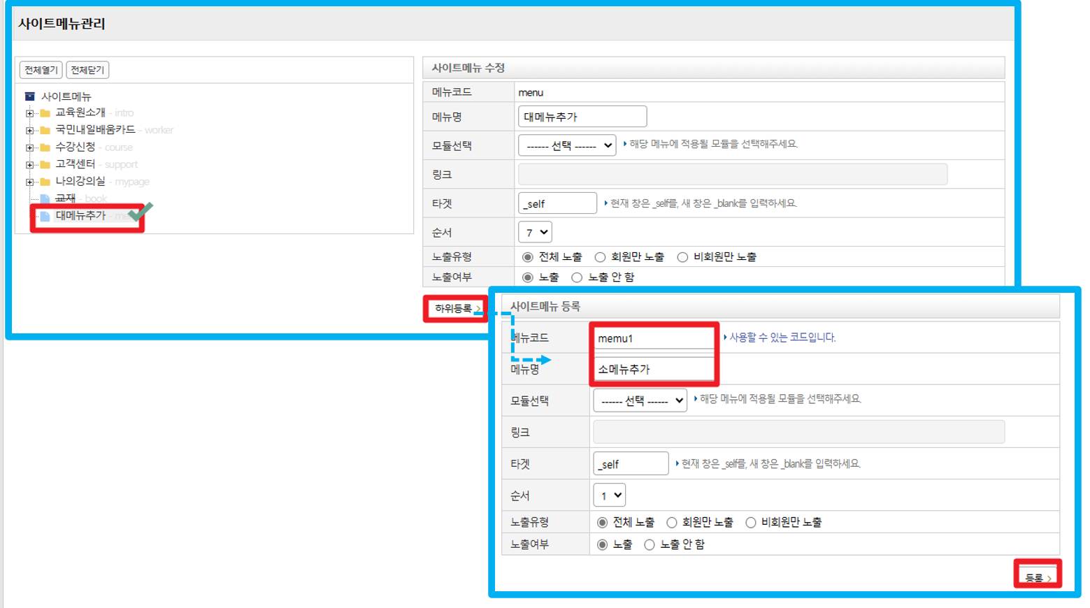대메뉴가 등록 되었다면 하위등록 (소메뉴)을 아래와 같이 해주시면 되십니다.