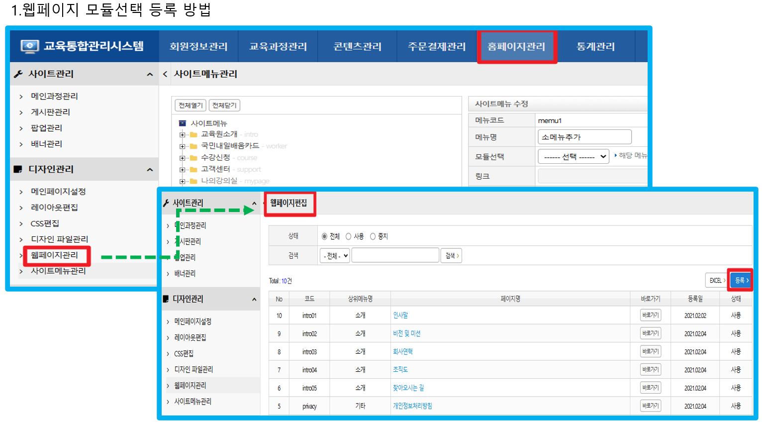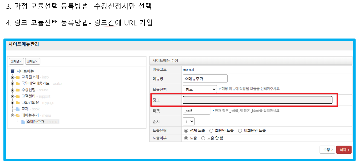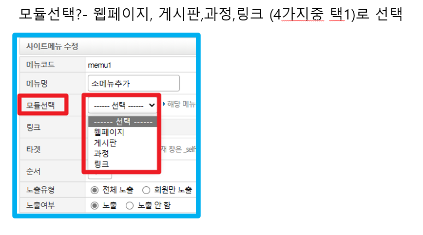 홈페이지 내 대메뉴 등록 및 소메뉴 (하위등록)시 모듈연결 방법 안내 입니다.