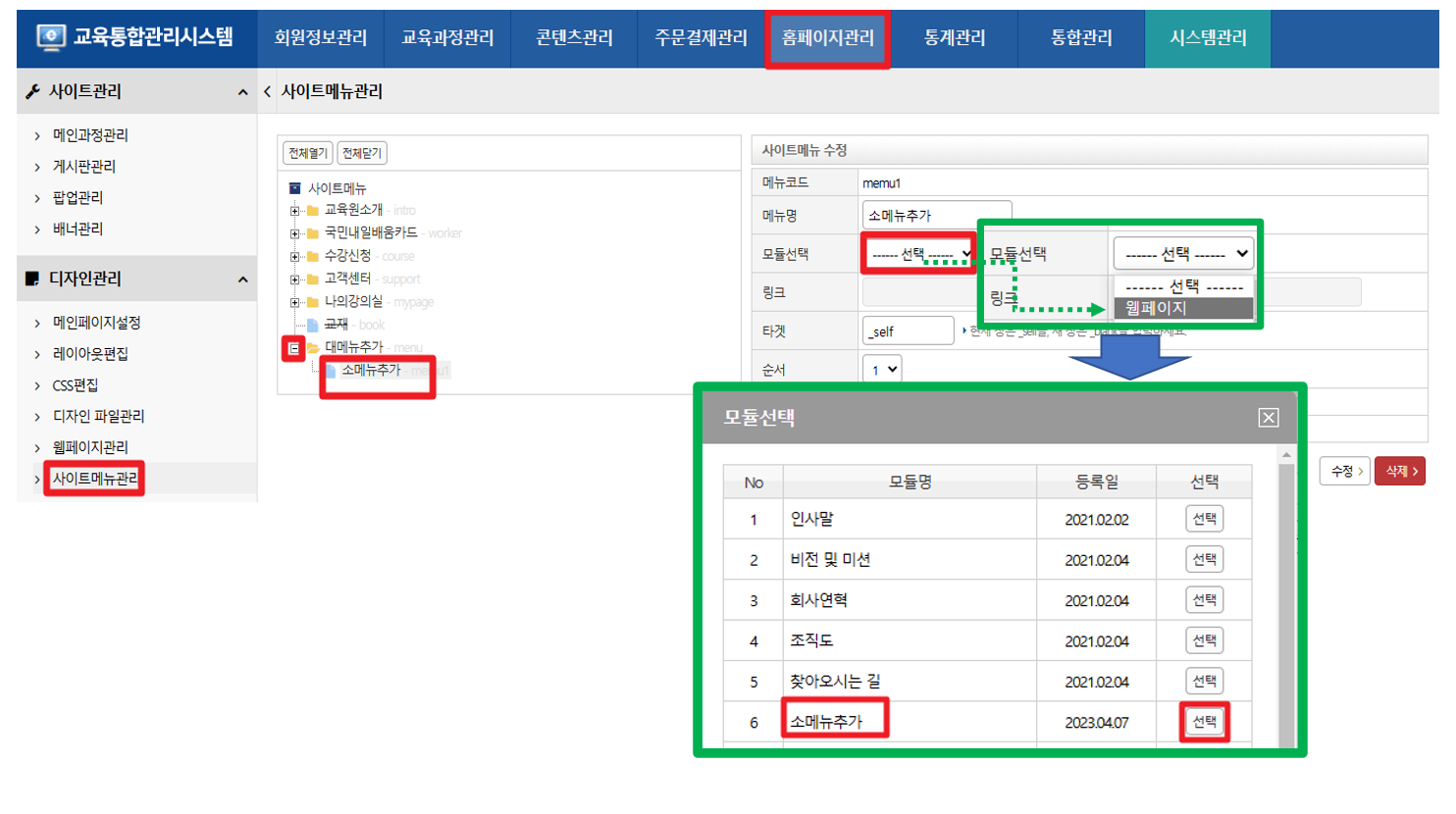 모듈선택 팝업창이 생성됨 - 좀 전에 웹페이지편집창에 등록했던 6번 소메뉴추가 (모듈명) 를 선택