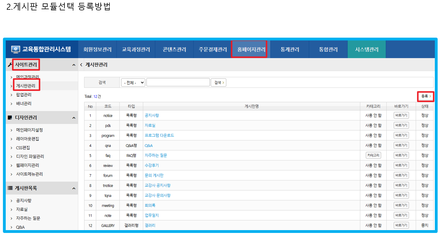홈페이지관리 > 사이트관리 > 게시판관리 클릭후 등록버튼