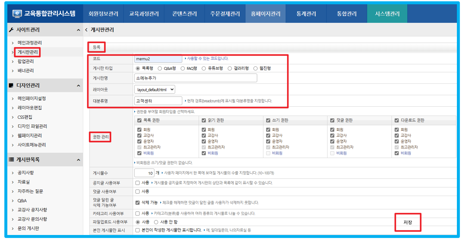 게시판관리 등록 버튼 에 코드 등 빨간색으로 박스친곳을 모두 기입 후 저장