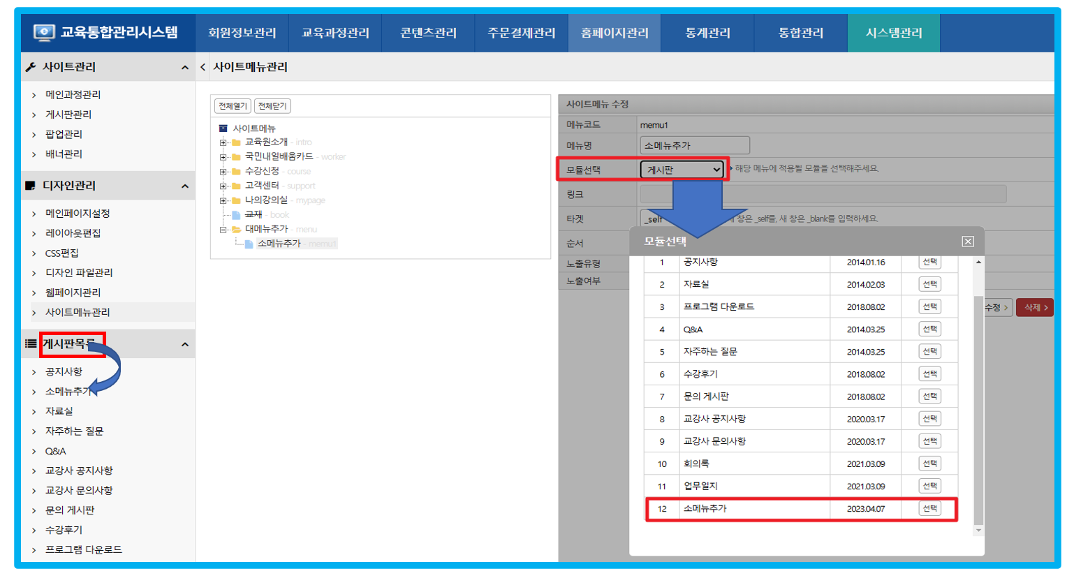 뜨며, 위에 등록했던 게시관 목록인 12번 소메뉴추가를 선택해서 연결