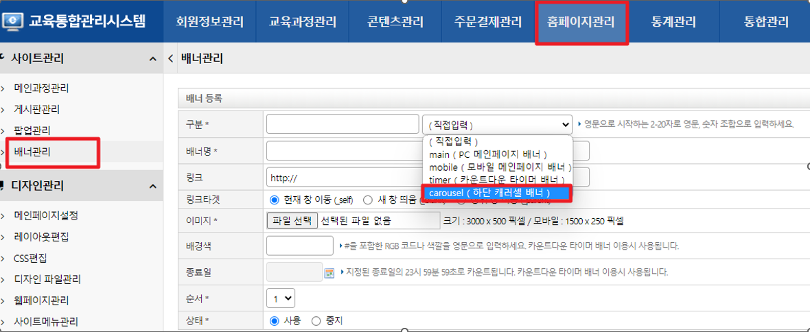 홈페이지관리 > 배너관리 > 구분에 하단캐러셀 배너 선택후