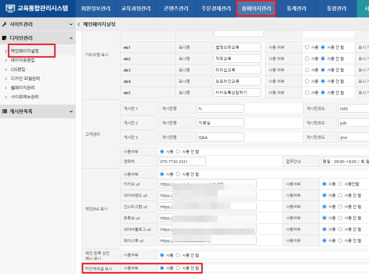 홈페이지관리 > 메인페이지설정 > 하단캐러셀 표시 : 사용여부 설정 (ON/OFF )
