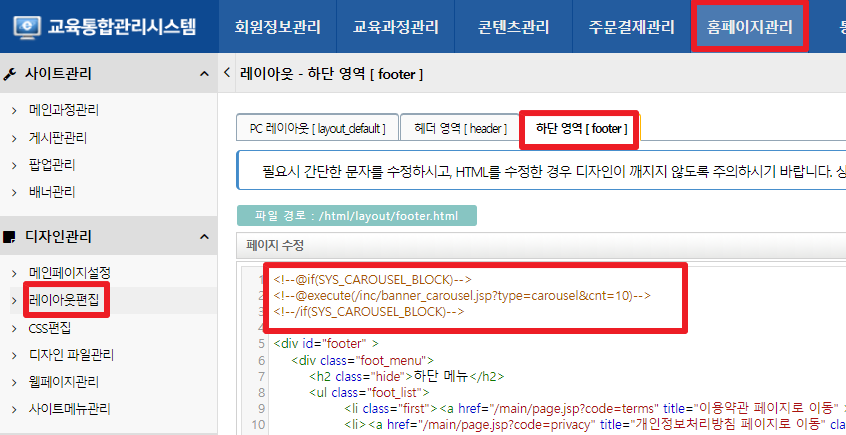 2. 홈페이지관리 >레이아웃편집 >하단영역에 다음과 같이 네모친 부분을 동일하게 넣어주세요