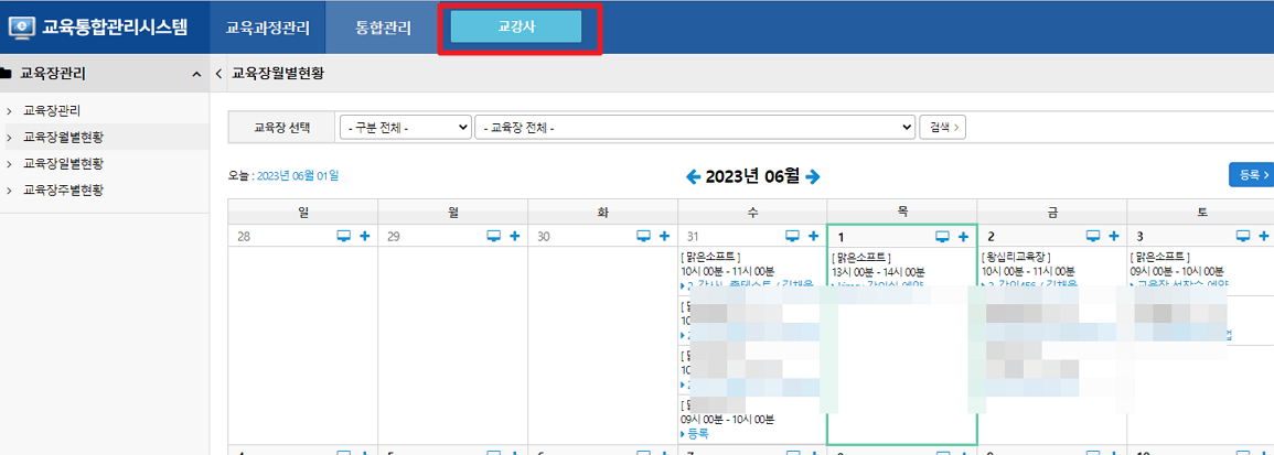 많은 훈련기관들이 집합강의목차에서 강의를 등록하시면 교육장관리에서 등록한 스케줄이 노출됩니다.