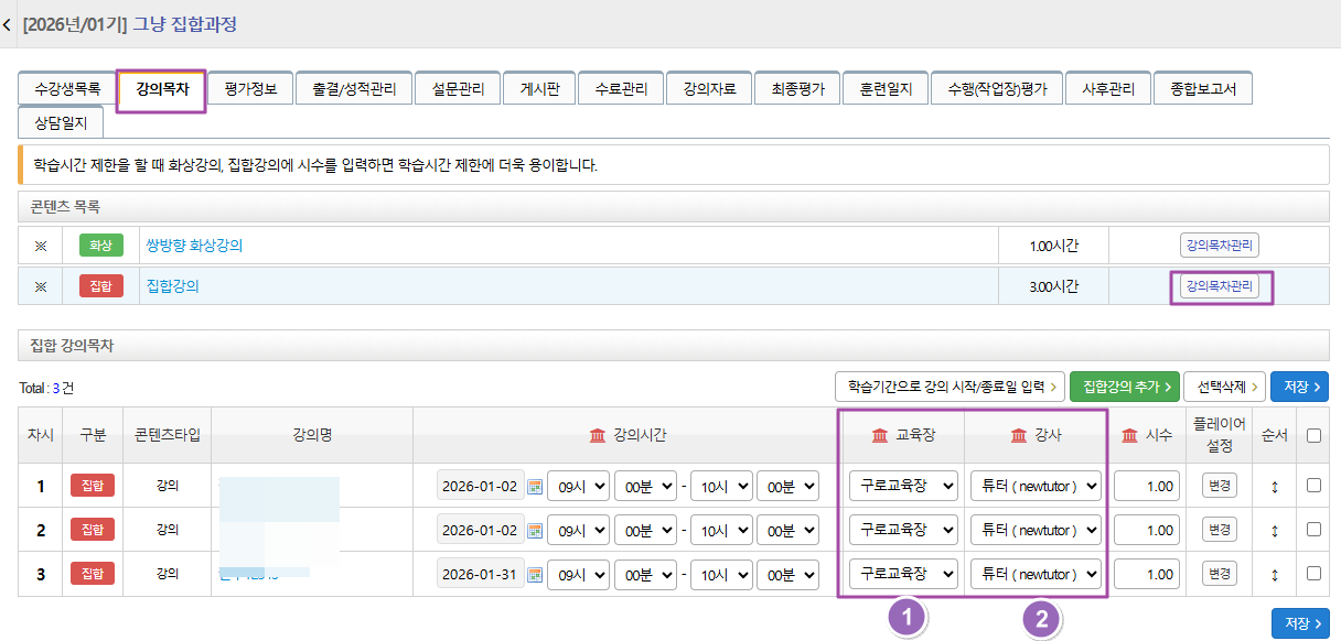 과정운영 > [강의 목차관리] 메뉴에서 강의를 추가할 때는 반드시 교육장과 강사 정보를 입력해야 합니다.
