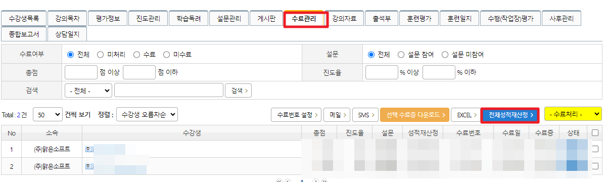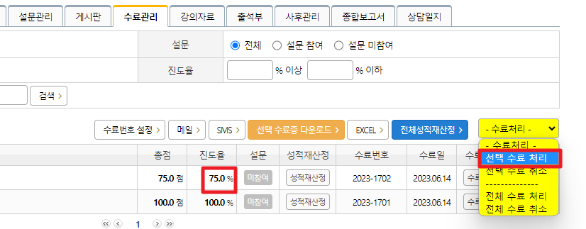 4.그런후 수료관리에서 성적재산정을 누르신후 선택수료처리 하시면 됩니다. ( 예시: 실제학습한 진도율이 80% 이하인 수강생을 수료기준에서 진도율을 0%로 설정했을때 수료처리 완료 )