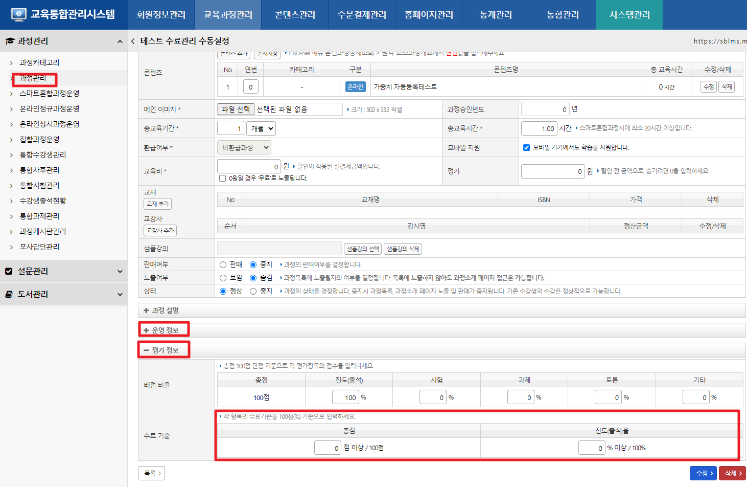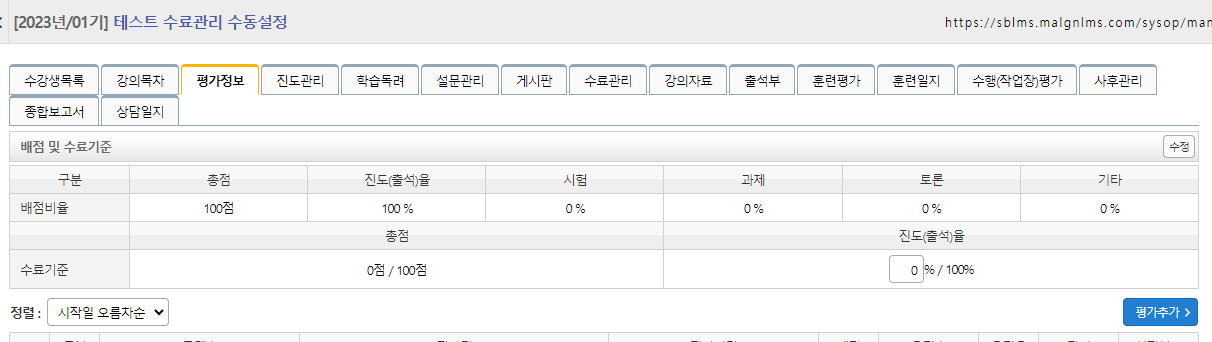 1. [교육과정관리 ] > [과정관리] > 해당 과정명 클릭후 맨 아래 평가정보 탭에서