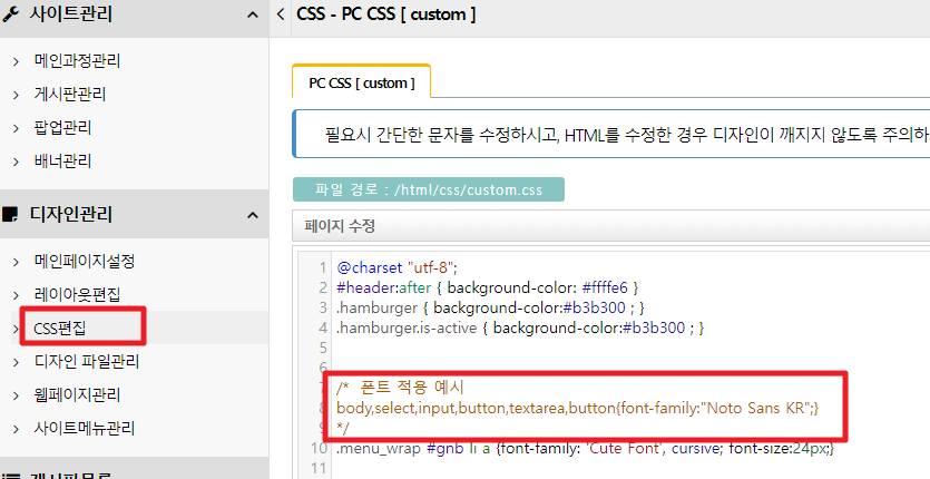 관리자페이지: css 편집에 다음과 같이 넣어주세요 ( 예시 )