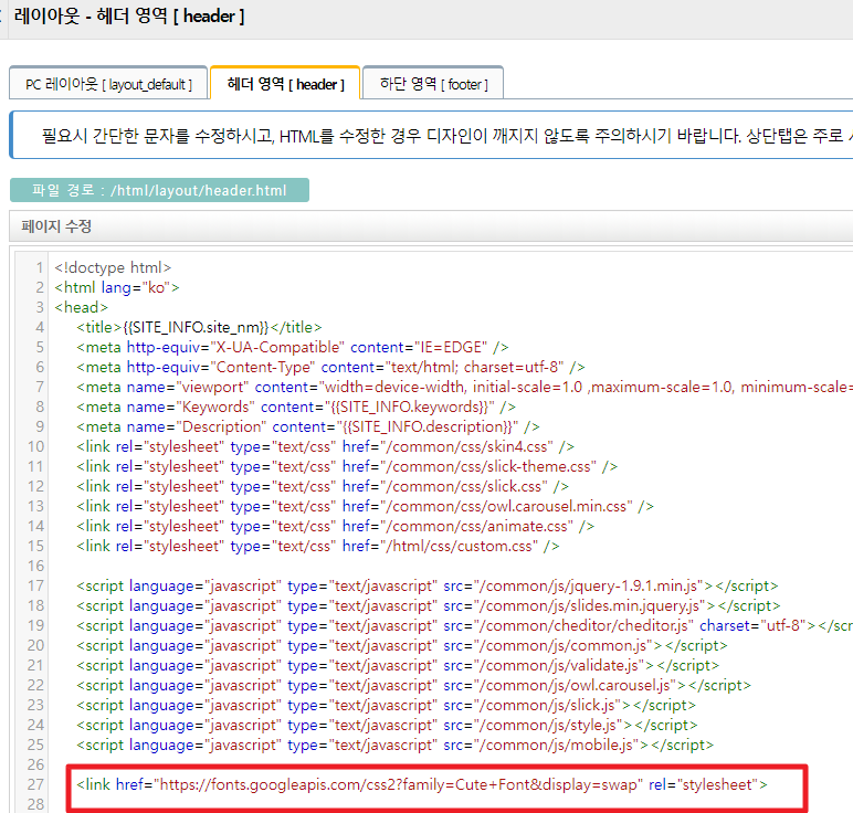 빨간색 박스 부분을 헤더에 넣으시고, 아래 font-family 부분은 css 편집에 넣어주시면 됩니다.