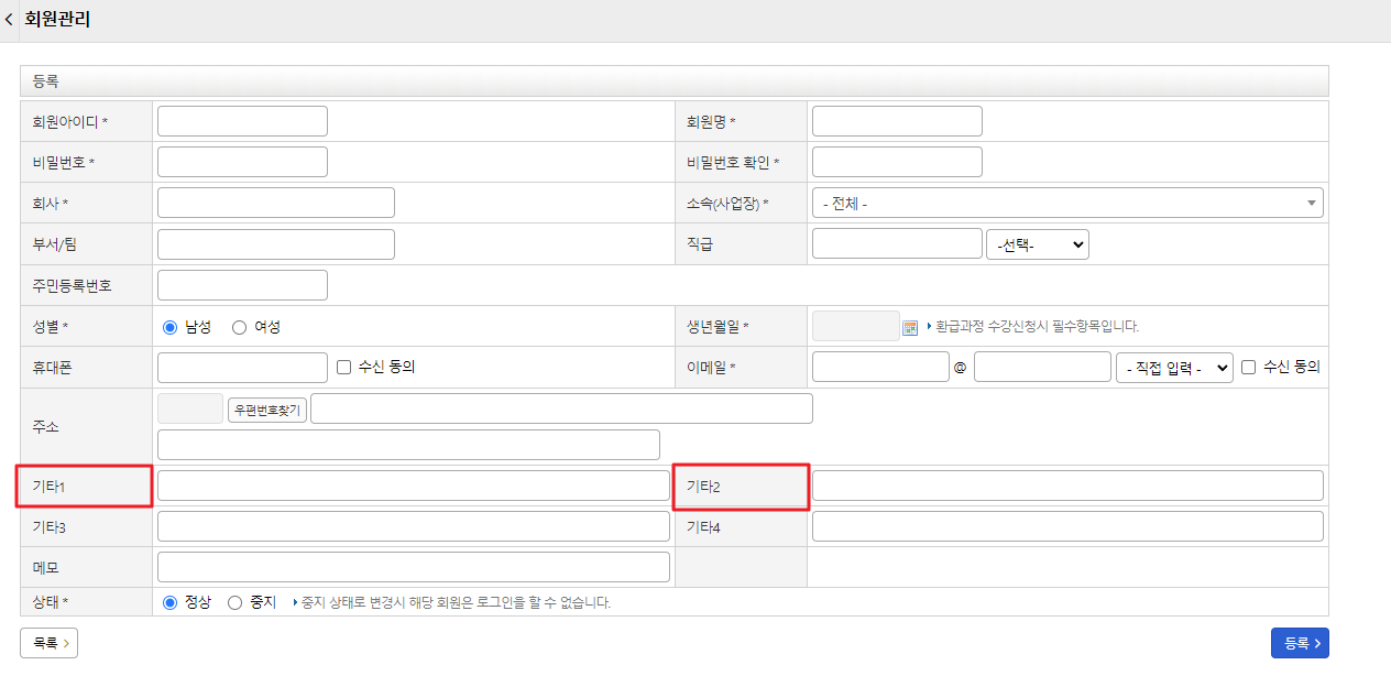 예시 ) 기타 1~4 는 관리자단의 기타1~4에 동일하게 들어가게 됩니다.