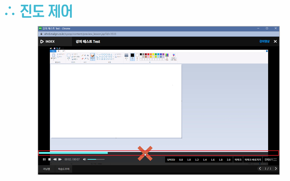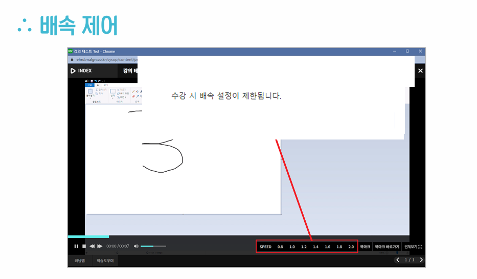 콘텐츠 타입인 프로그램WBT 을 사용 하여 강의를 진행 하실 때 배속 기능 및 진도를 제어 할 수 있습니다.