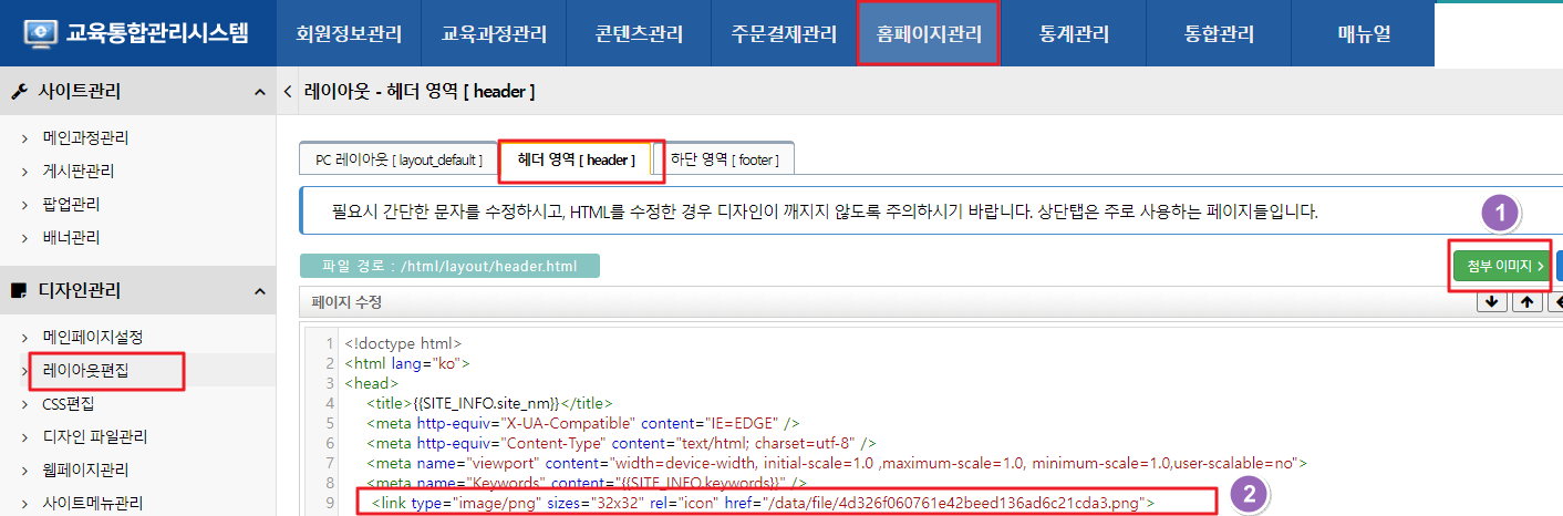 홈페이지관리 > 디자인관리 > 레이아웃편집 > 헤더 영역