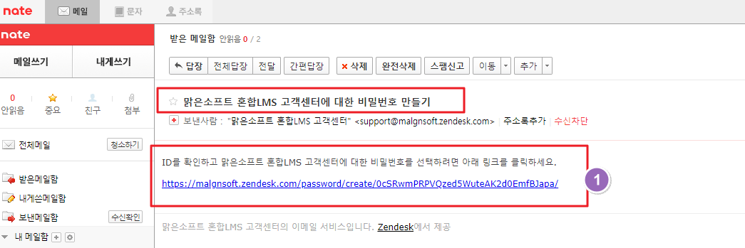 (1) 전달해주신 이메일에 로그인을 하시면 아래와 같이 [맑은소프트 혼합 LMS 고객센터에 대한 비밀번호 만들기 ] 로 메일을 받으시게 됩니다.