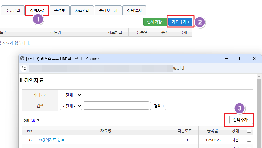 해당 개설한 과정명의 강의자료 탭에서 자료 추가를 하시면 됩니다.