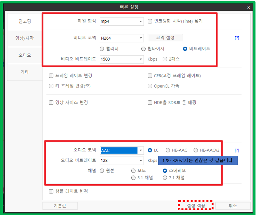 그리고, 오디오 비트레이트는 128정도만 해도 음질에 문제는 없지만, 좀 퀄러티를 높이려면 320정도까지는 괜찮은 것 같습니다.